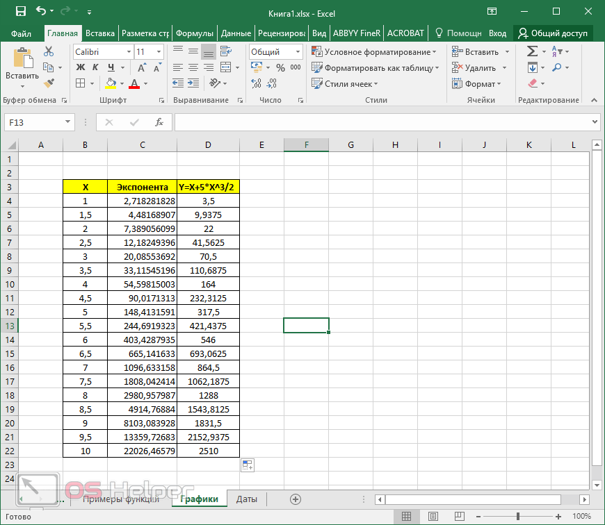 - Создадим таблицу. В первой графе у нас будет исходное число «X», во второй – функция «EXP», в третьей – указанное соотношение. Можно было бы сделать квадратичное выражение, но тогда бы результирующее значение на фоне экспоненты на графике практически пропало бы.