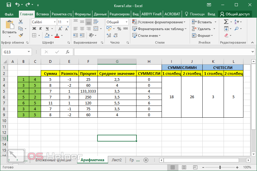 - Excel может складывать с учетом сразу нескольких условий. Можно посчитать сумму клеток первого столбца, значение которых больше 2 и меньше 6. И ту же самую формулу можно установить для второй колонки.