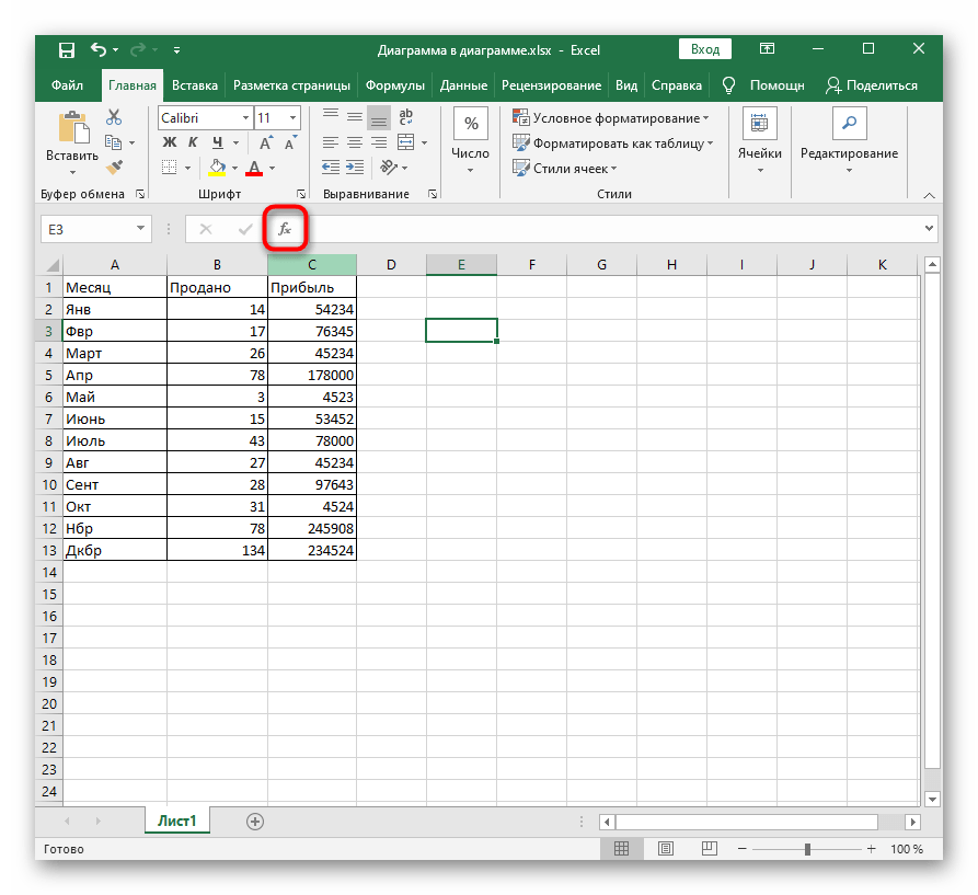 - При вставке формулы всегда в первую очередь выбирается ячейка, где в дальнейшем будет располагаться конечное значение. Сделайте это, нажав по подходящему блоку ЛКМ.