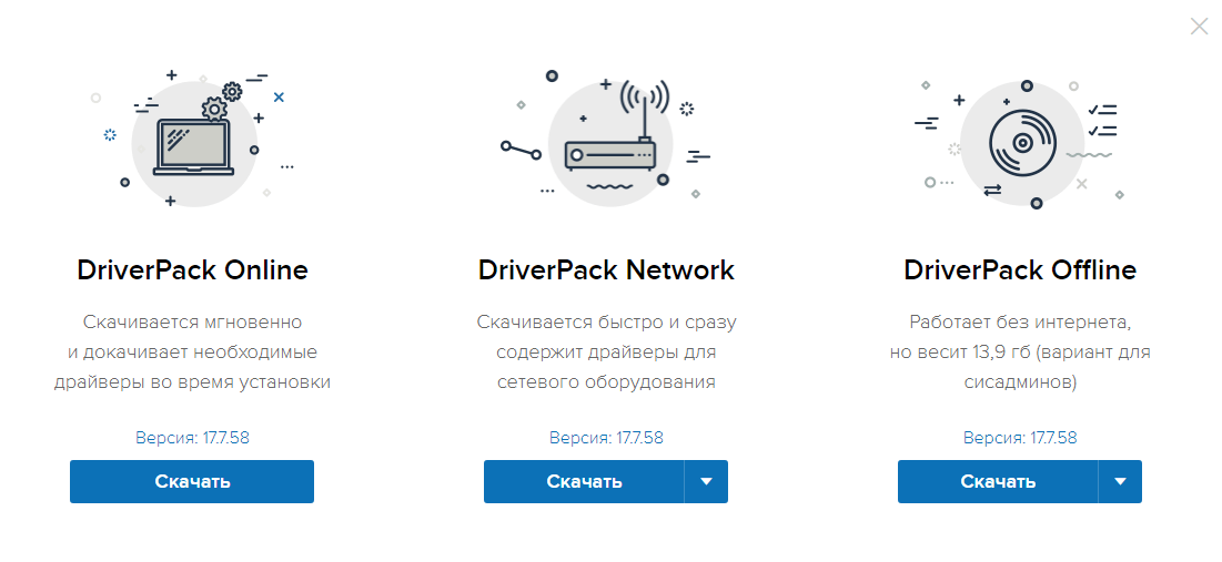 Проходим мимо больших зеленых кнопок, ищем ссылку «другие версии приложения» и кликаем по ней. Мы попадаем на страницу, где нам предлагают воспользоваться тремя вариантами на выбор. Если всё в порядке с интернетом, то скачиваем Драйвер пак онлайн. С интернетом перебои — скачиваем Драйвер пак оффлайн, но он весит 13,9 гб. Поэтому идём туда, где крутой интернет. Скачиваем там и переносим на флешку, а потом уже на свой компьютер.
