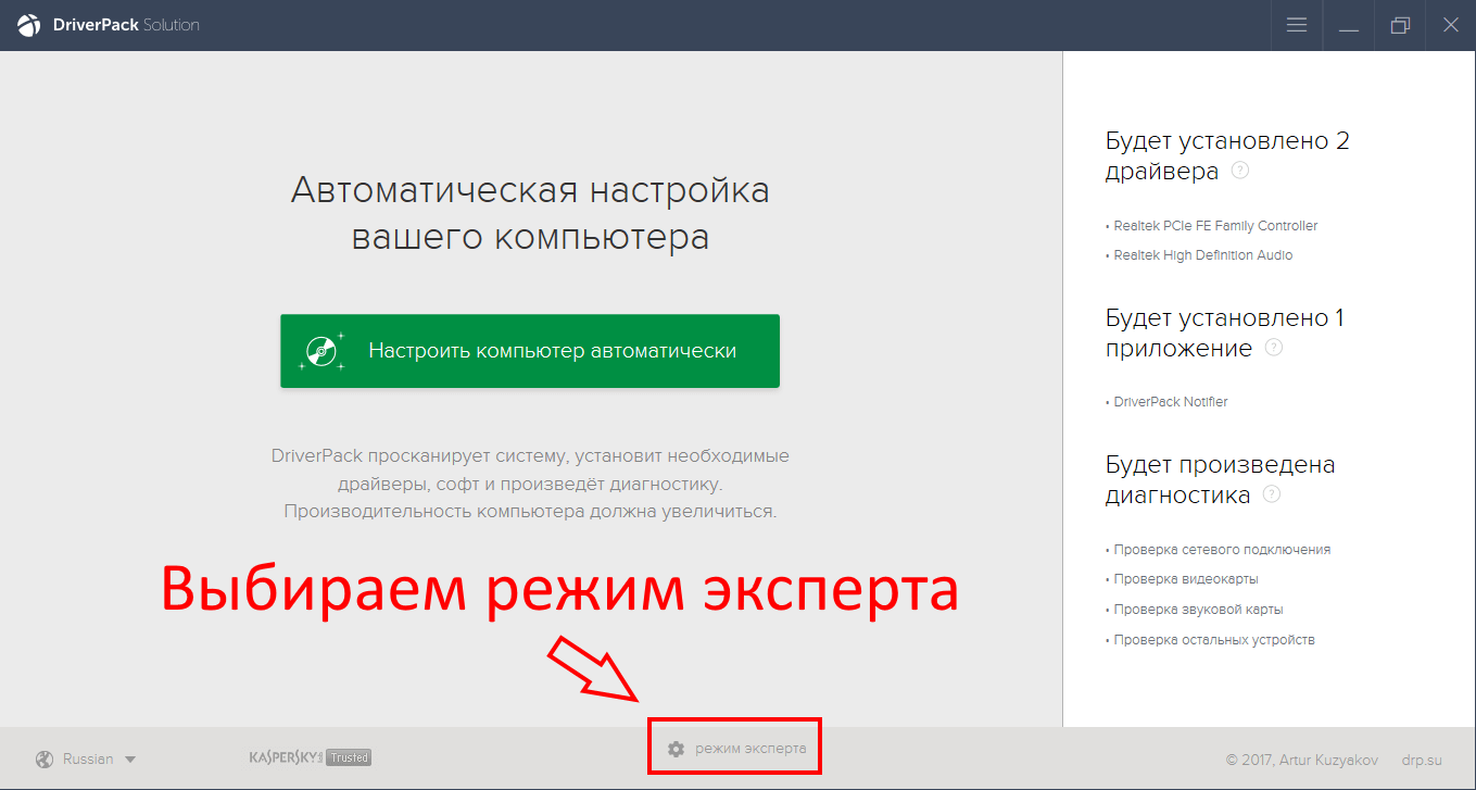 Игнорируем большую зеленую кнопку с автоматическими настройками и переходим в режим эксперта. Кнопка находится внизу.