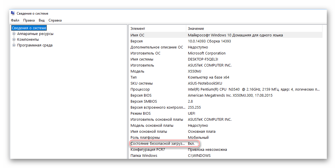 Откроется окно «Информация о системе». Здесь найдите «Безопасное состояние загрузки». Его значение должно быть включено.