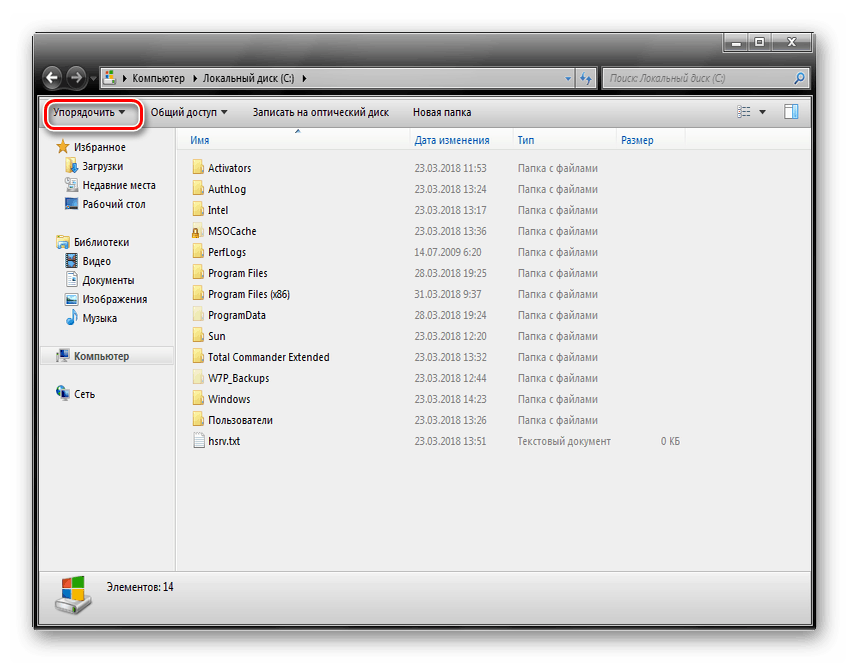 - Открываем «Проводник» и щелкаем по пункту «Упорядочить».