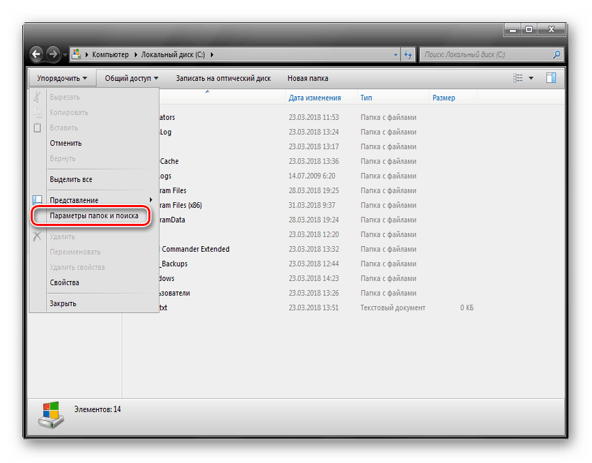- В выпадающем меню выбираем «Параметры папок и поиска».