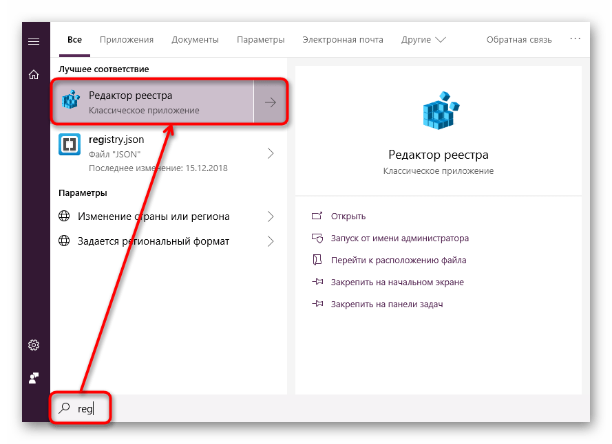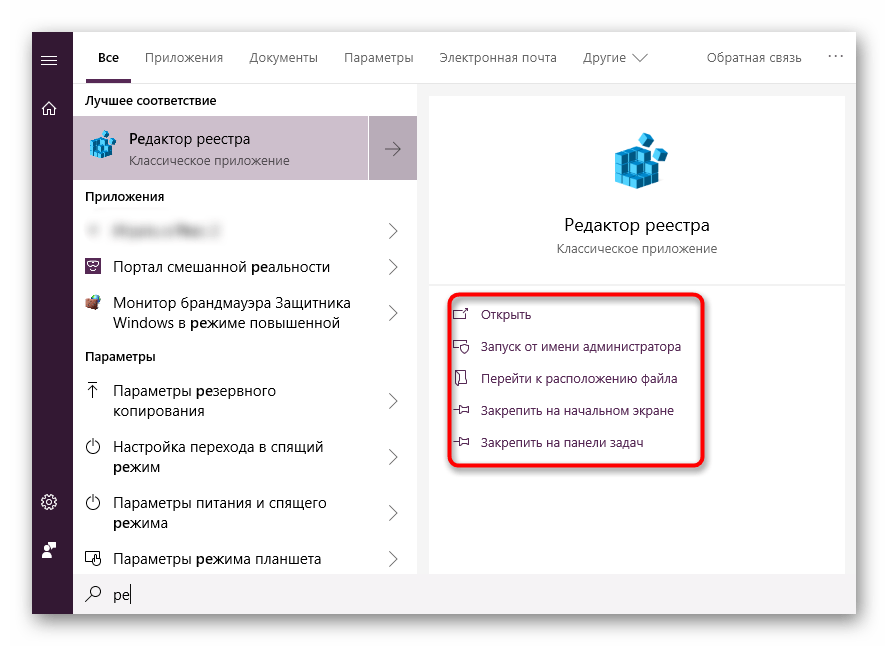 Запуск Редактора реестра в Windows 10