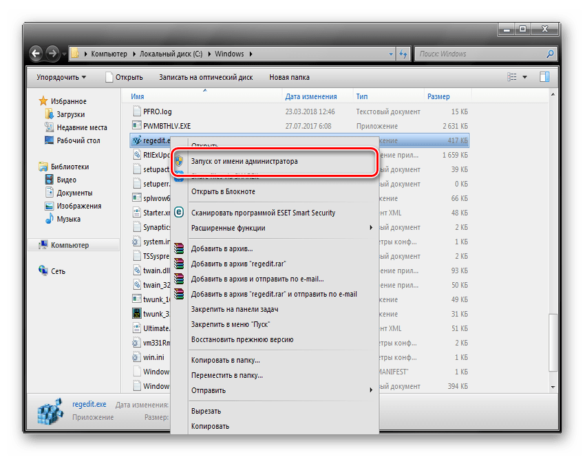 - Нужный файл находится именно в этой папке. Требуется только найти «regedit.exe» и запустить его с правами администратора (щелкнуть правой кнопкой мыши по файлу и выбрать пункт «Запуск от имени администратора»).