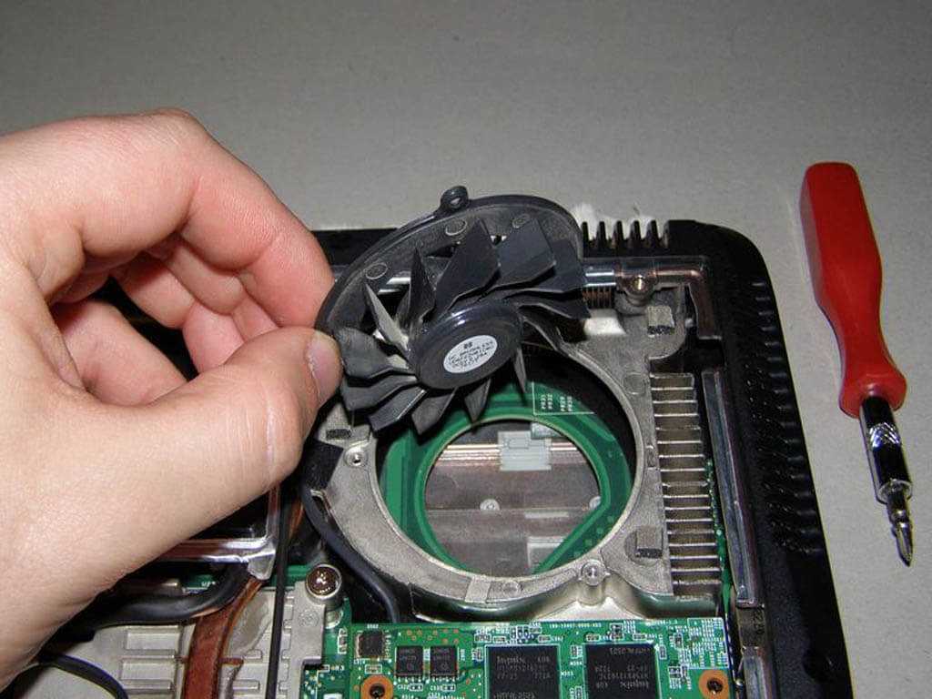 При остановке кулера из-за накопления на нем пыли необходимо разобрать ноутбук и очистить лопасти вентилятора и пространство вокруг. Если кулер нуждается в замене, заменить его новым. С подробной инструкцией Вы можете ознакомится в подзаголовке «Самостоятельная чистка ноутбука».