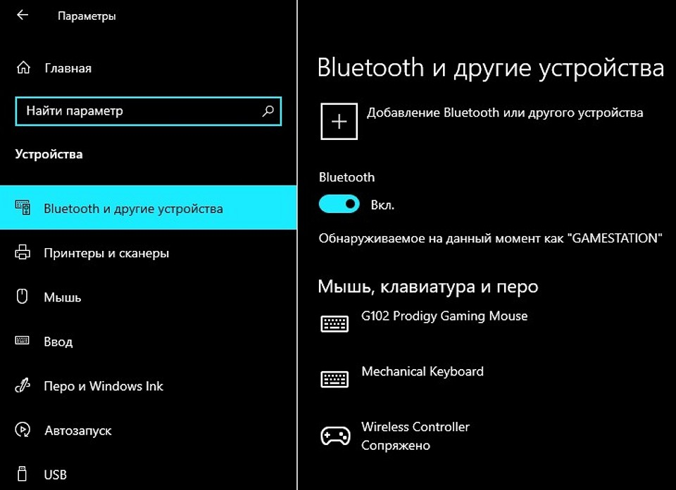 Можно нажать на соответствующую иконку в трее и выбрать «Добавление устройства Bluetooth», либо зайти в «Параметры» – «Устройства» – вкладка «Bluetooth и другие устройства».