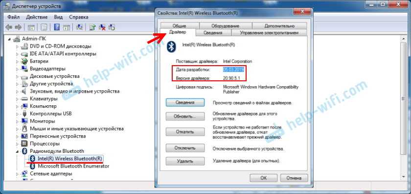 Откройте диспетчер устройств и на вкладке «Радиомодули Bluetooth» откройте свойства Bluetooth модуля. У меня он назывался до обновления драйвера Generic Bluetooth Adapter. Открываем его свойства и на вкладке «Драйвер» смотрим дату разработки и версию.