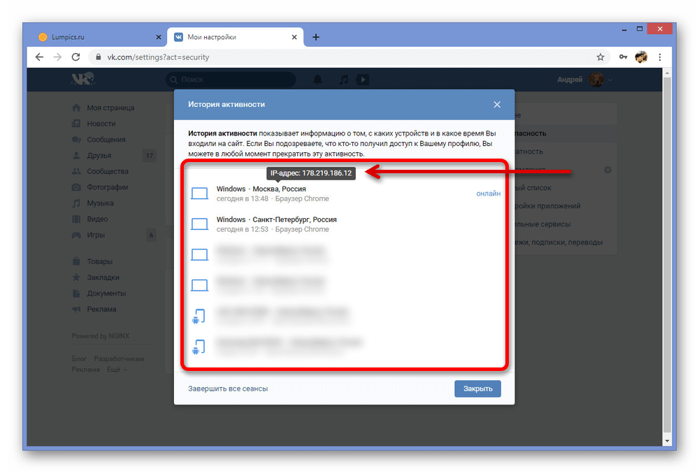 Одним из дополнительных средств в социальной сети, доступных как с веб-сайта, так и в мобильном приложении, является журнал посещений. Данный раздел позволяет следить за успешными авторизациями, включая использование стороннего ПО, и по необходимости блокировать сеансы.