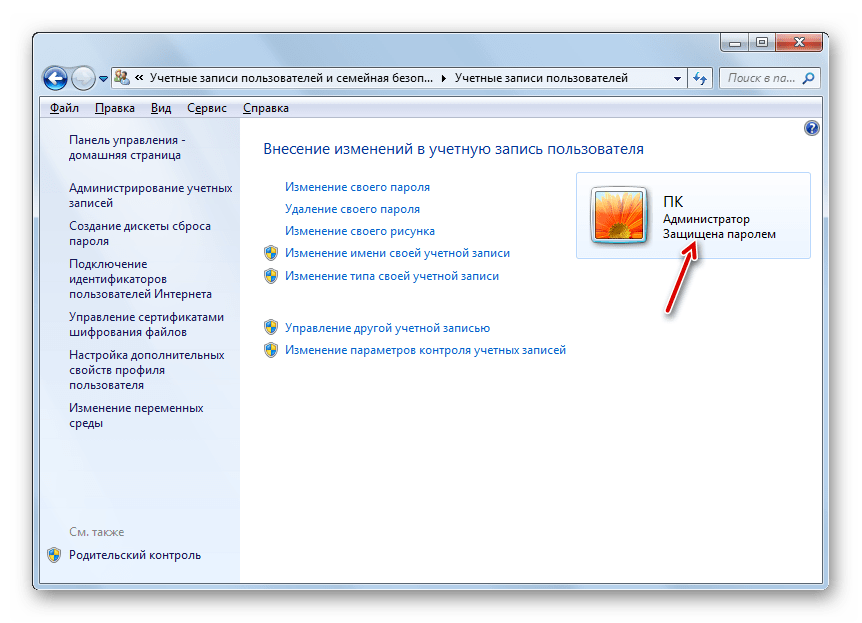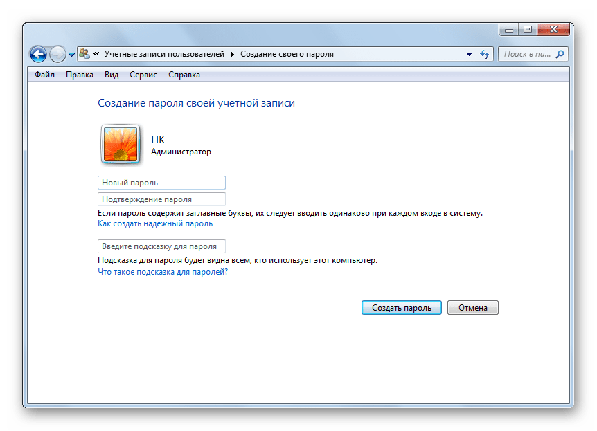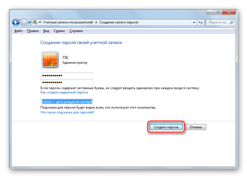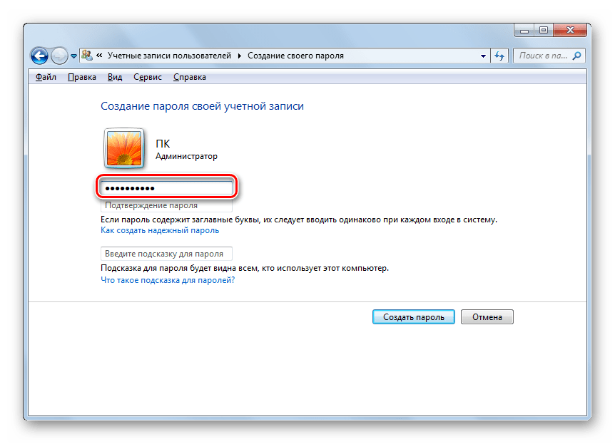 В операционной системе Windows 7 пароль устанавливается таким образом: