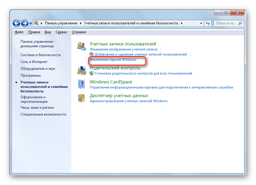 Кликните на «Изменение пароля Windows» в разделе «Учетные записи пользователей».