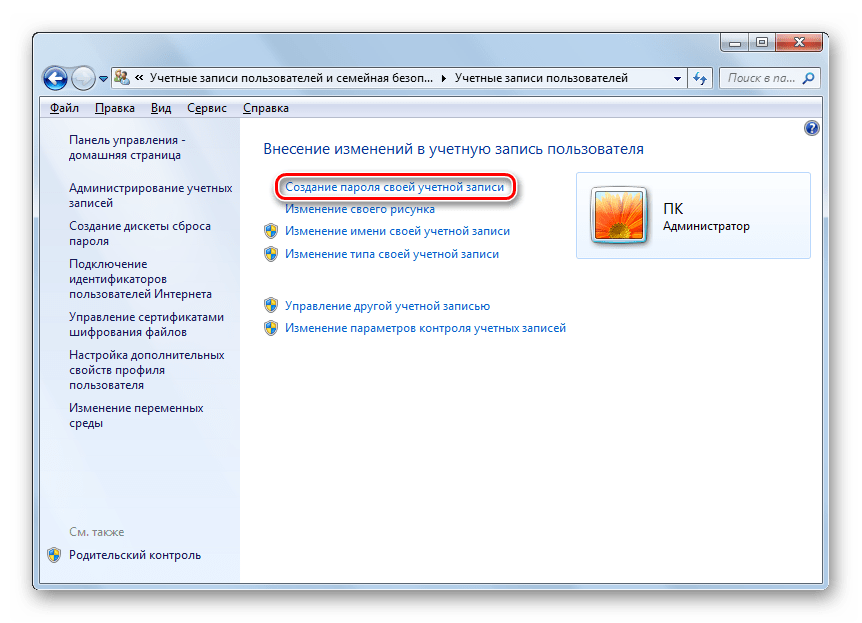 - В открывшемся окне справа, выберите ссылку «Создание пароля своей учетной записи».