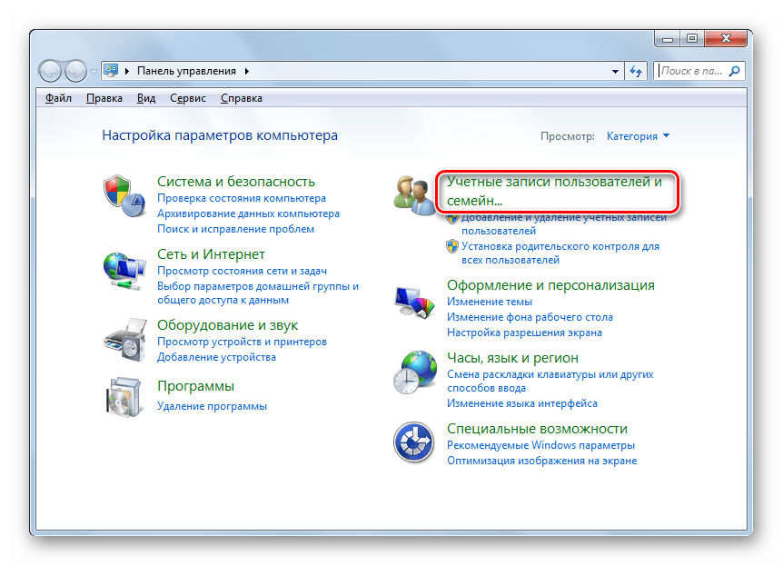 В Панели управления находим «Учетные записи и семейная безопасность» и кликаем по пункту «Изменение типа учетной записи«.