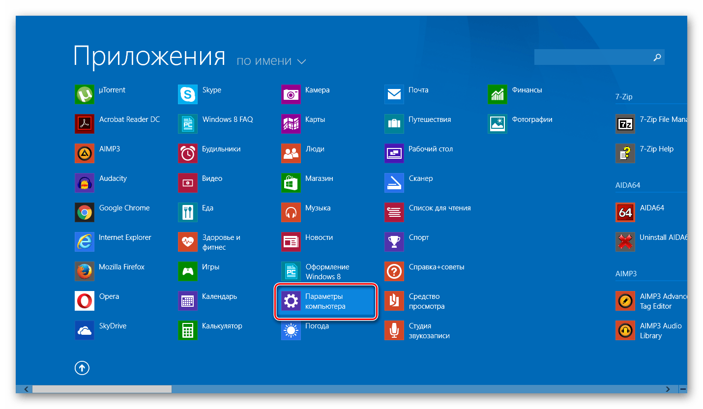 - Найдите «Параметры компьютера» в стандартных приложениях Windows «Меню пуск» (так это выглядит на 8-ке, в Виндовс 10 получить доступ к «Параметрам» можно по нажатию соответствующей кнопки в меню «Пуск» или посредством использования комбинации клавиш Win+I).