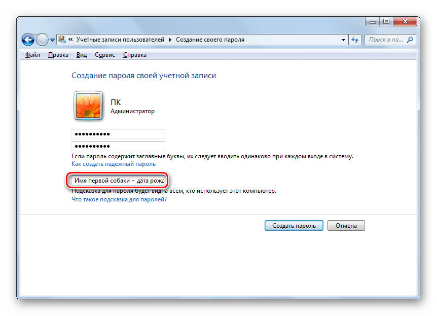 Далее прописываем пароль, подтверждаем его, и прописываем подсказку. Жмем ниже кнопку «Создать пароль«.