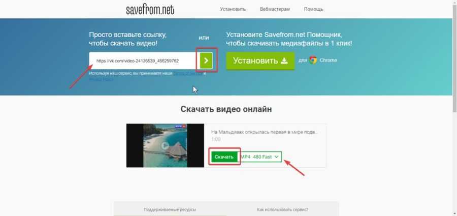 Для скачивания нужно зайти на сайт savefrom и вставить ссылку на видео. Теперь нажмем на зеленую иконку справа от текстового поля в которое вставлена ссылка.