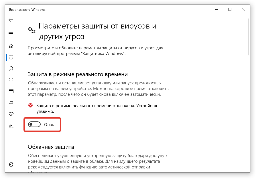 - Деактивировать параметр «Защита в режиме реального времени»