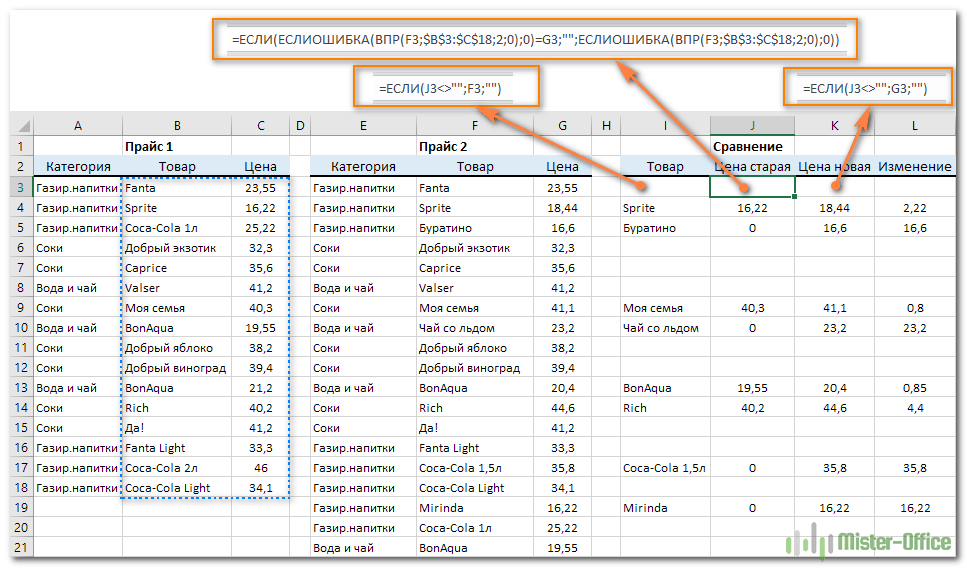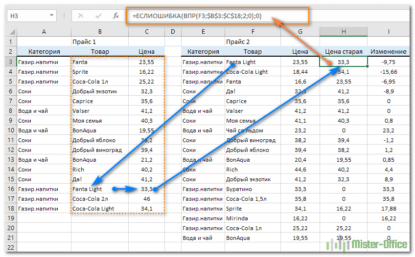 берёт наименование товара из второго прайса, ищет его в первом, и в случае удачи извлекает соответствующую цену из первой таблицы. Она будет записана рядом с новой ценой в столбце H. Если поиск завершился неудачей, то есть такого товара ранее не было, то ставим 0. Таким образом, старая и новая цена оказываются рядом, и их легко сравнить простейшей операцией вычитания. Что и сделано в столбце I.