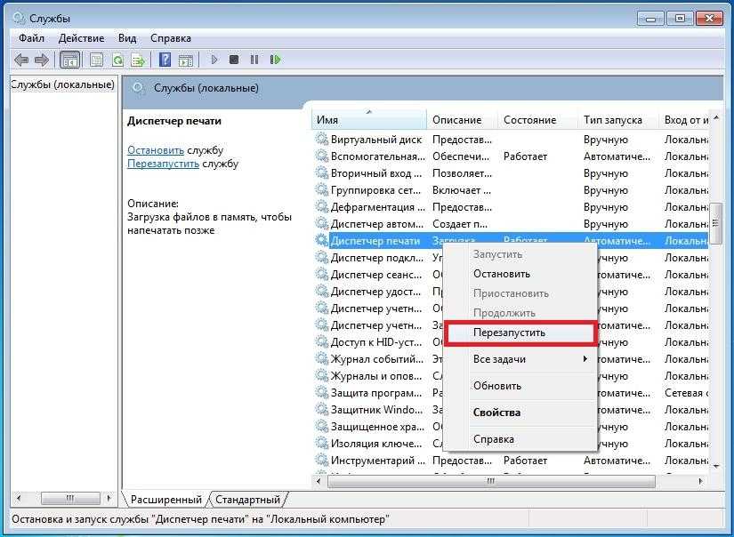 В открывшемся списке ищем службу «Диспетчер печати» и кликнем по ней правой кнопкой мыши, далее выберем пункт «Перезапустить».