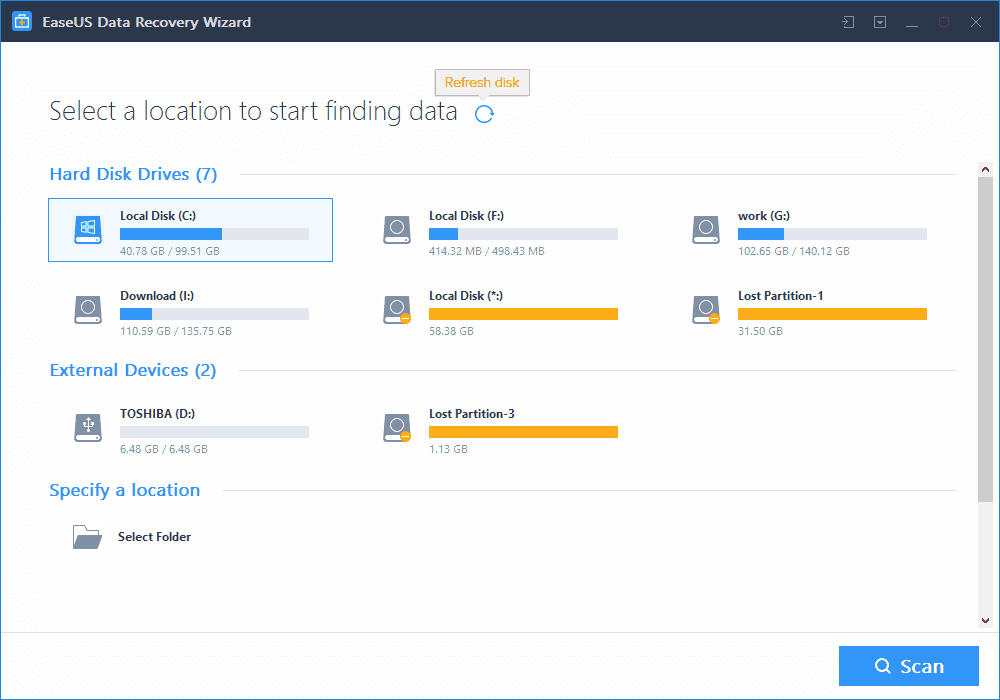 Запустите EaseUS Data Recovery Wizard, выберите расположение потерянных игровых файлов нажмите кнопку «Сканировать».