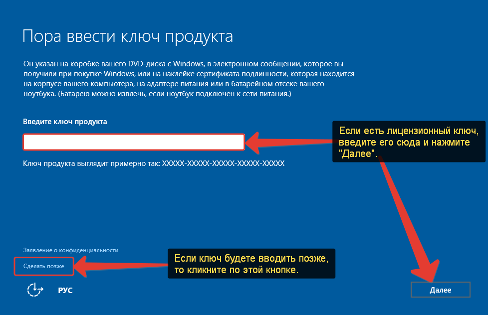 Введите ключ активации системы. Если на данный момент он у вас отсутствует, выберите пункт «У меня нет ключа активации». Вы сможете активировать систему потом.