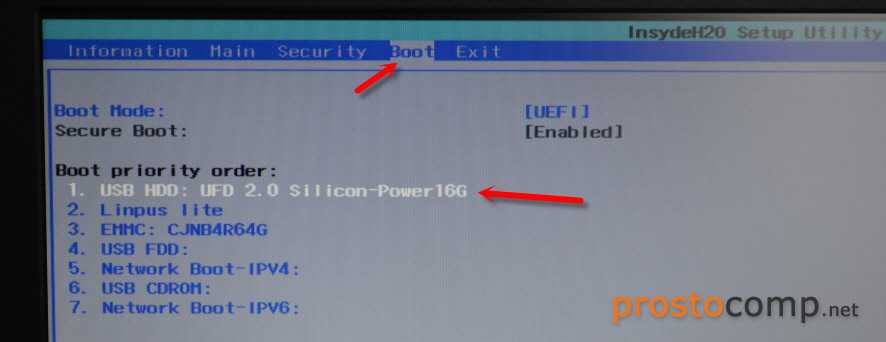 - в меню «Boot» выставить загрузку с установочной флешки;
