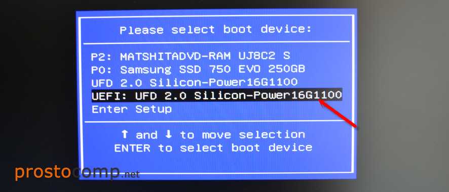 - Выбрать необходимое устройство для загрузки через загрузочное меню «Boot Menu».