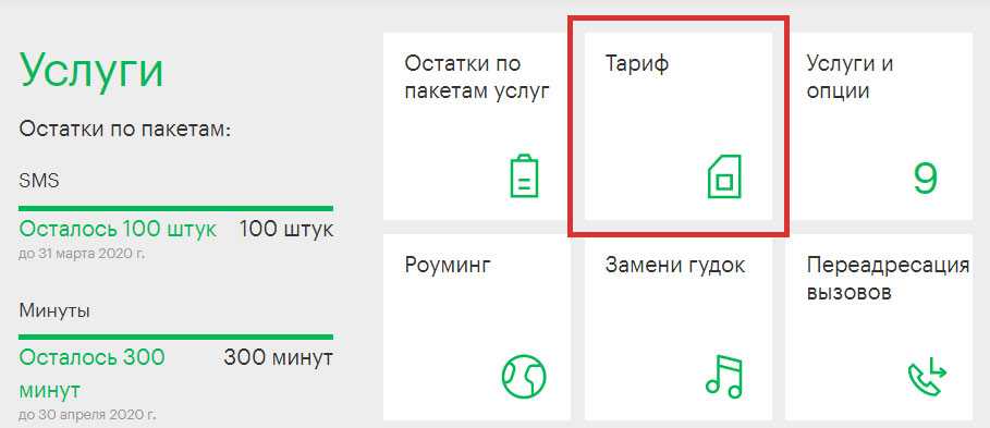 Авторизовавшись в сервис-гиде, прокрутите страницу вниз до раздела «Услуги» и выберите плитку «Тариф».