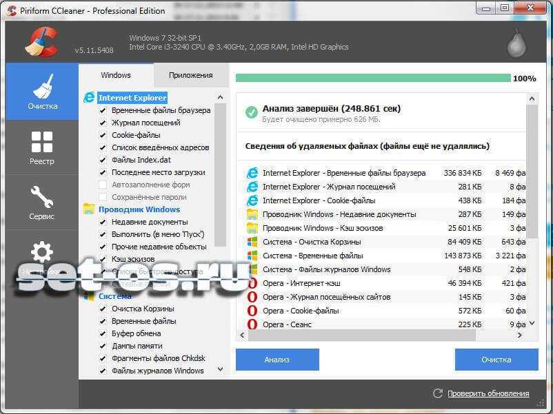 Если Вашей операционной системе Виндовс уже более года, то за это время она накапливает очень много различных данных, которые тоже надо чистить — дампы памяти, резервные копии, различные журналы и списки. Да и программы, которые у Вас установлены, тоже забивают пространство временными файлами и разным мусором. Самый яркий пример — веб-браузеры, из-за которых тоже пропадает место на диске С под историю, кеш и cookie-файлы. Быстро и относительно безопасно расчистить эти «Авгиевы конюшни» поможет утилита CCleaner:
