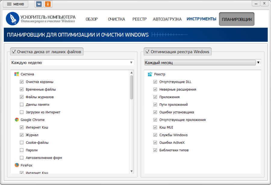 Нет времени производить регулярные чистки? С Ускорителем Компьютера вы можете больше об этом не беспокоиться, ведь он имеет встроенный календарь проверок. Зайдите во вкладку «Планировщик». Вам достаточно задать периодичность и выбрать производимые действия — далее программа будет очищать ваш ПК самостоятельно.