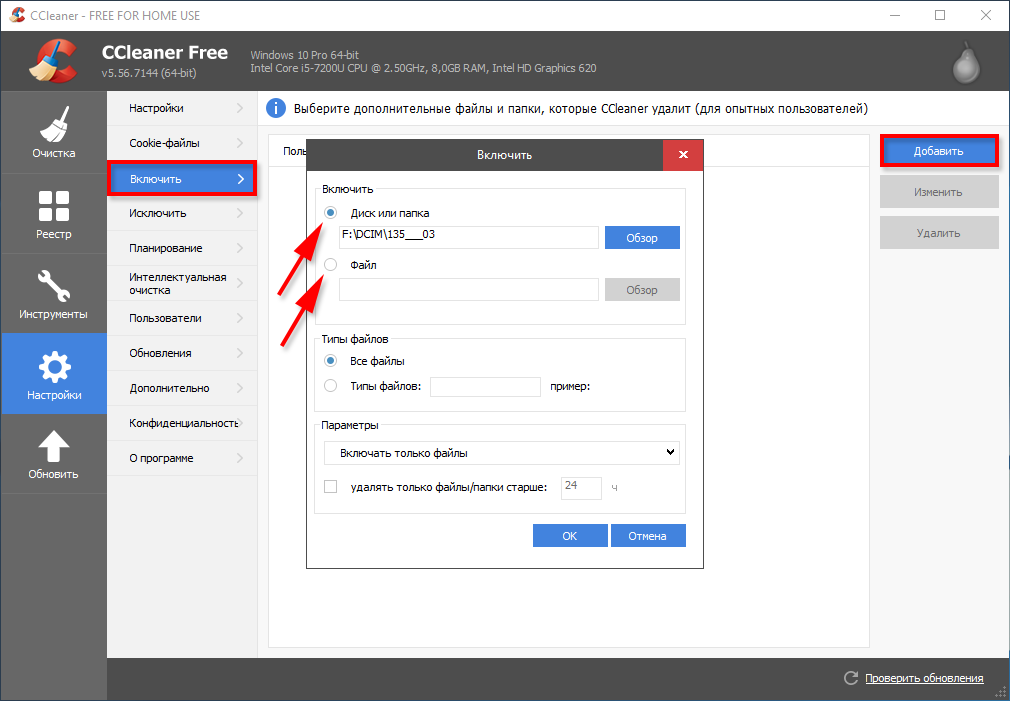 В разделе настроек «Включить» нажмите на кнопку «Добавить». Откроется диалоговое окно включения файлов и папок в список для уничтожения. Выберите расположение (опция «Диск или папка») или конкретные файлы (опция «Файл»), которые необходимо надежно стереть.