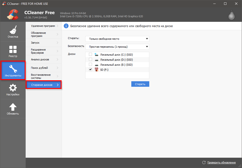 Для очистки дисков нажмите на иконку слева «Инструменты» и перейдите в раздел «Стирание дисков». Из выпадающего списка «Стирать» выберите вариант очистки диска: «Только свободное место» или «Весь диск (все данные будут уничтожены)».
