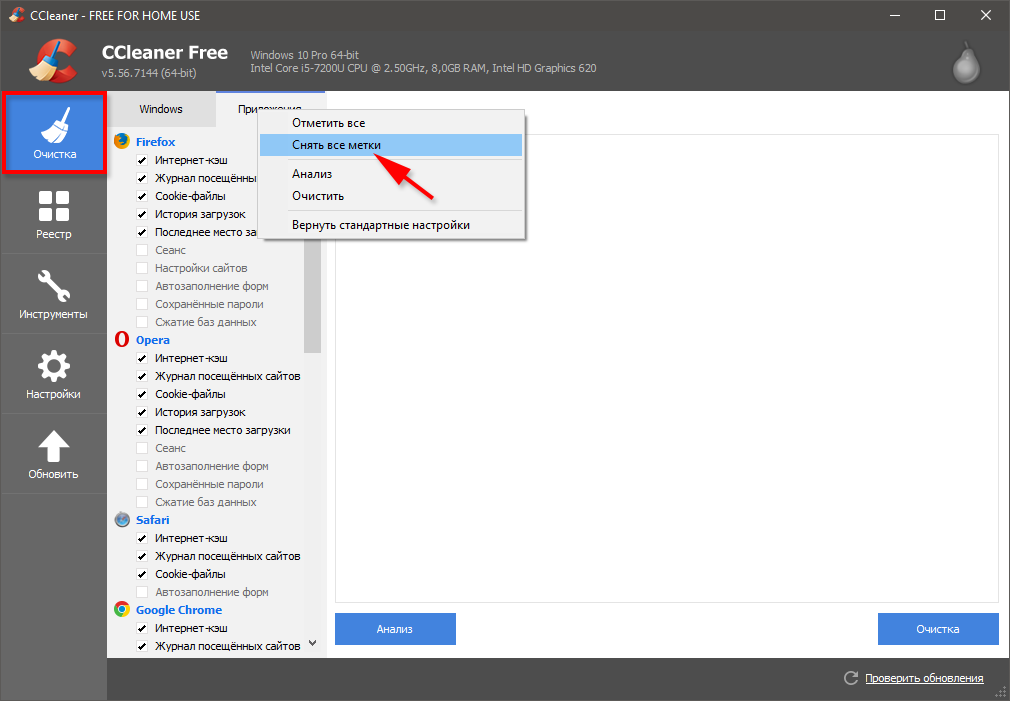 После добавления файлов и папок в список уничтожения нажмите в главном меню слева на иконку «Очистка». В CCleaner по умолчанию уже отмечены некоторые разделы для очистки. Так как нам нужно уничтожить только выбранные вручную файлы, необходимо убрать все поставленные галочки. Чтобы сделать это быстро, по очереди нажмите правой кнопкой мыши на вкладки «Windows» и «Приложения» и выберите команду контекстного меню «Снять все метки».
