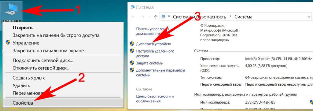 Чтобы это выполнить, следует открыть диспетчер оборудования. Для этого нужно зайти в раздел «Компьютер» и нажать на «Свойства». В открывшемся разделе отыскать и выбрать «Диспетчер».