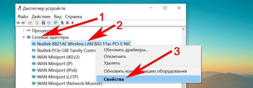 Появится окно, выбираем из списка «Сетевые адаптеры», жмем на строке ПКМ «Realtek 8821AE Wireless LAN…..» (у вас название беспроводного адаптера будет другое), выбираем «Свойства».