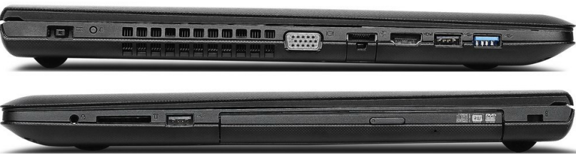 Порты в ноутбуке Lenovo IdeaPad B5400 не поражают воображение своим разнообразием, хотя и имеющегося ассортимента вполне достаточно для работы: комбинированный аудиовыход, DVD-привод, 1 USB 2.0, HDMI, сетевой порт RJ-45, замок Кенсингтона, VGA, картридер, 2 USB 3.0, гнездо для подключения зарядного устройства и специальный разъём Lenovo OneLink.