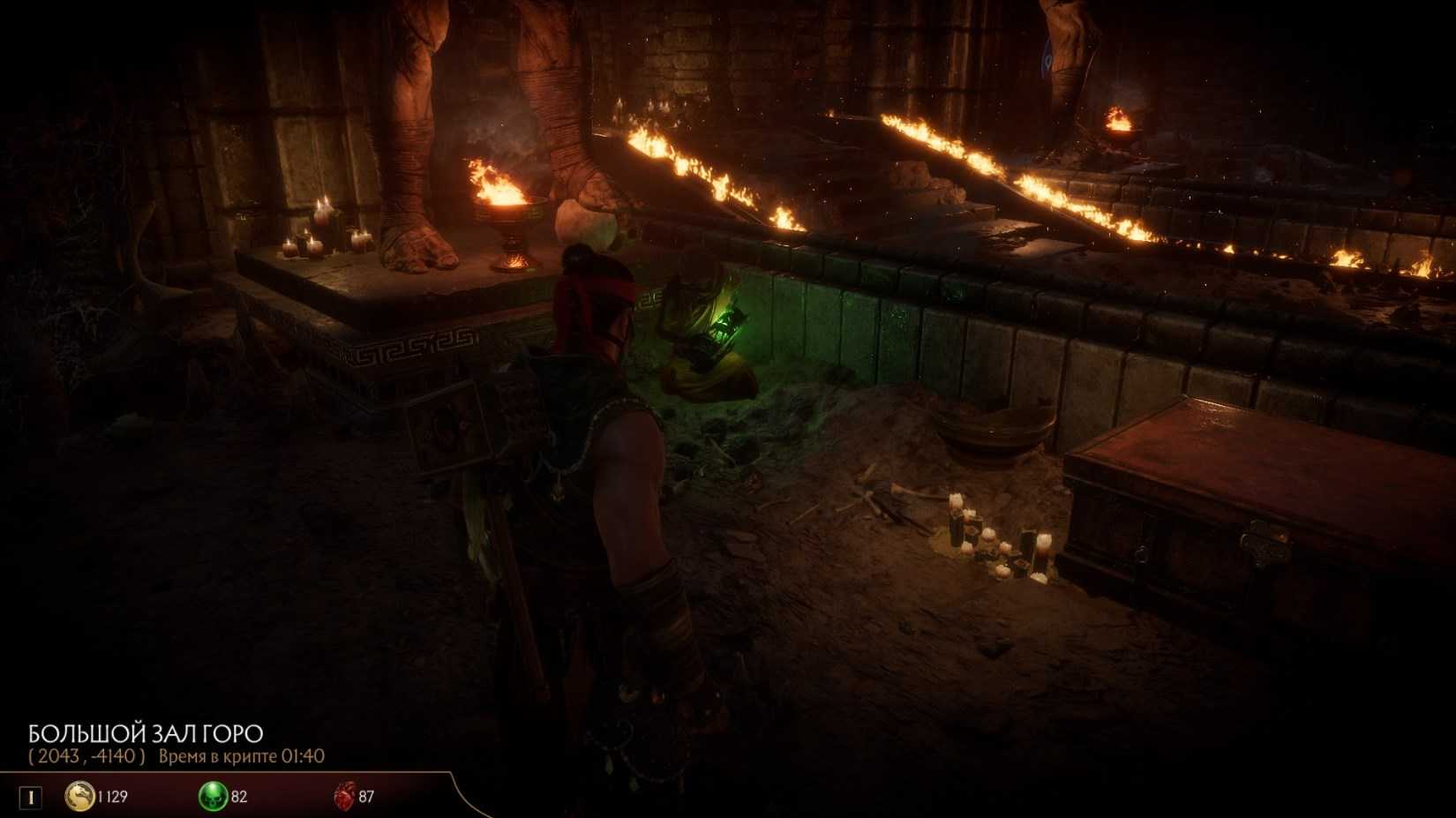 Взаимодействуйте с данной статуей, тем самым Вы увидите заставку, и боец, известный как Рептилия, выйдет из укрытия и убежит. С этого момента Вы можете найти его в случайных местах внутри Крипты, но чтобы найти его Вы все равно должны использовать Повязку. Найдите его и убейте боевым молотом Шао Кана, он взорвется, а вы получите 200 фрагментов душ и зеленый скин Скорпиона.