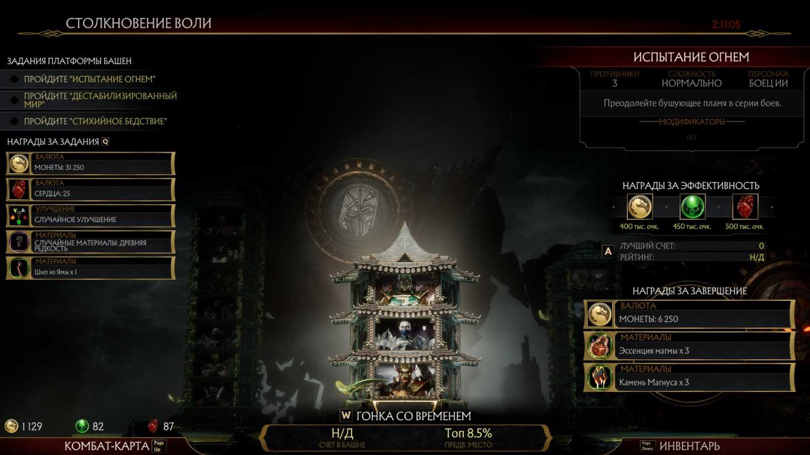 Башня Времени — самое эффективное место для зарабатывания денег и снаряжения. Для этого надо пройти много разнообразных и подчас странных испытаний. Будет много непонятных боев с неравными условиями: например, Вам предложат победить соперника в двух раундах, в то время как ему достаточно победить в одном. Или во время боя могут лететь наносящие неблокирующий урон ракеты.