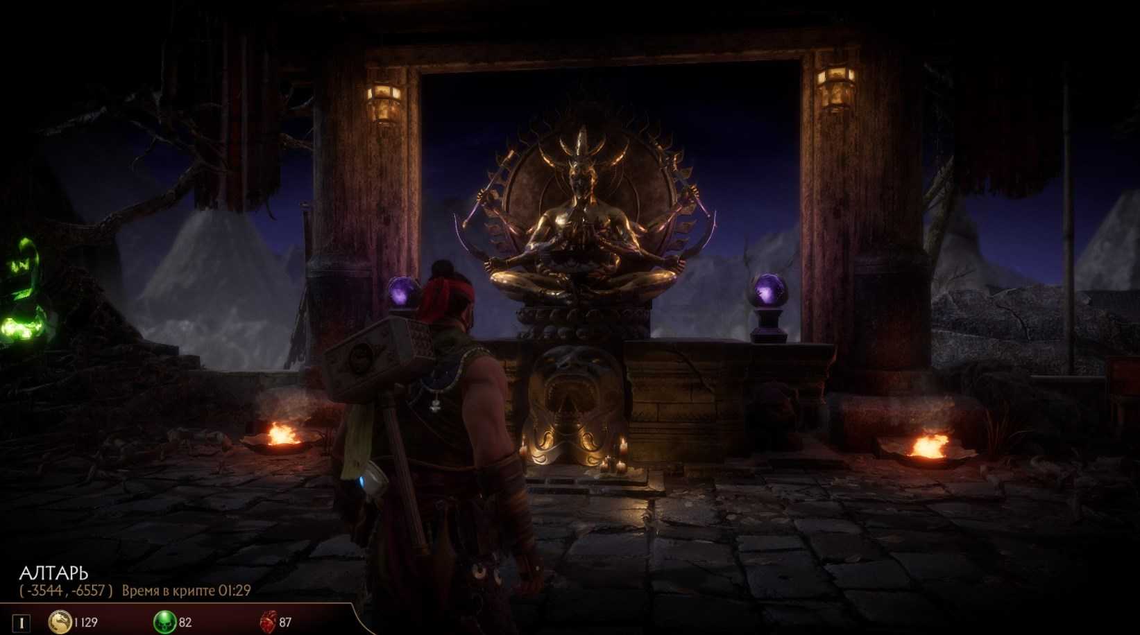 Доступ к нему можно получить, открыв дверь на Горном перевале. На механизме есть три отверстия для амулетов главных злодеев игры: Кроники, Цетрион и Шиннока. И пока что это последний и единственный замок, который мне не поддался – просто потому, что для его прохождения нужно чудовищно много гриндить.
