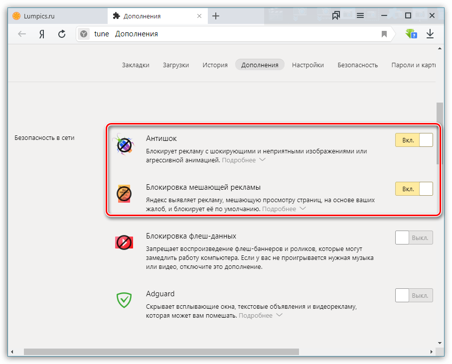 В появившемся окне найдите блок «Безопасность в сети» и отключите дополнения «Антишок» и «Блокировка мешающей рекламы».
