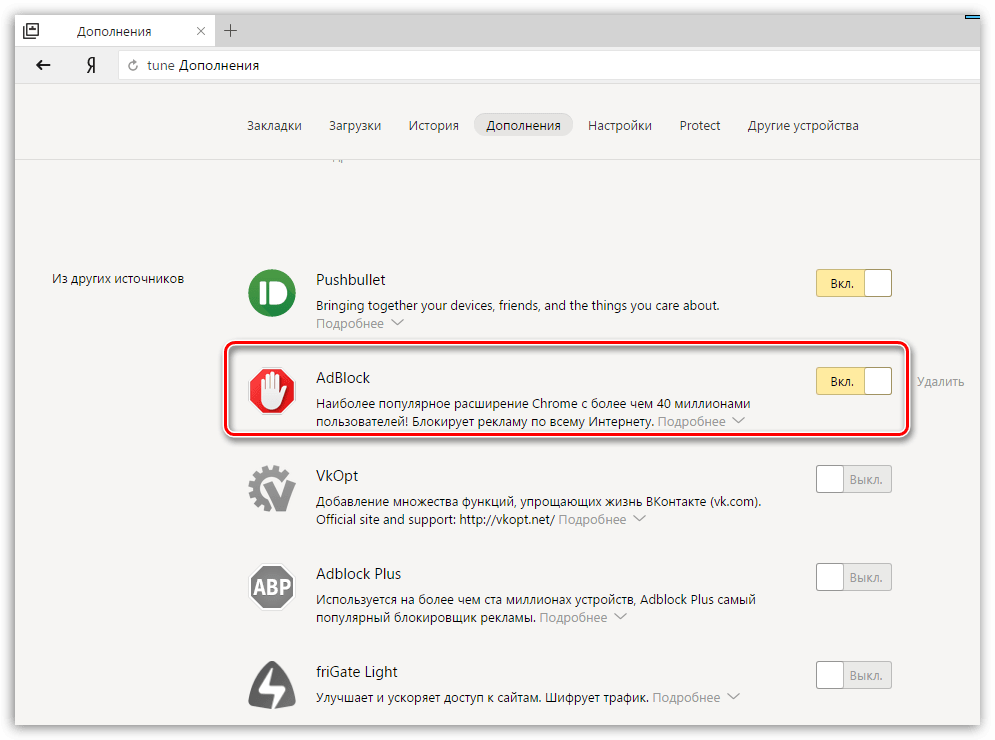 Простой способ, как отключить расширение AdBlock в Яндекс browser на некоторых веб-ресурсах: