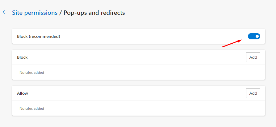 - Нажмите кнопку «Добавить» рядом с полем «Разрешено отправлять всплывающие окна» и используйте параметр перенаправления. Введите адрес этого сайта и нажмите Добавить.