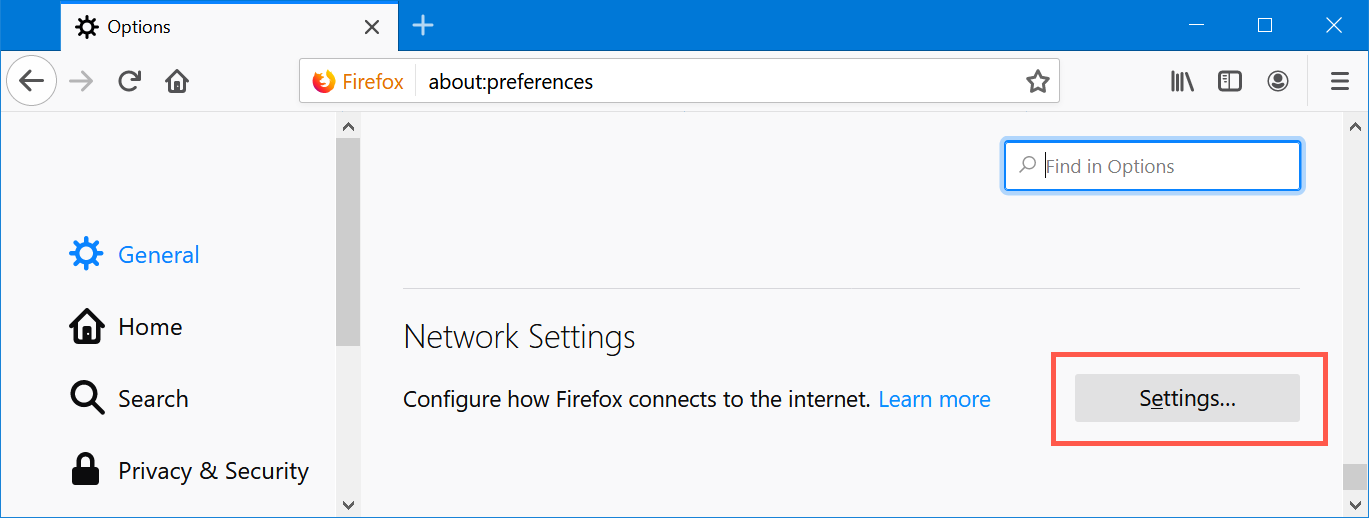 - Перейдите на страницу «about: settings», прокрутите вниз до «Network Settings» и нажмите кнопку «Settings…».
