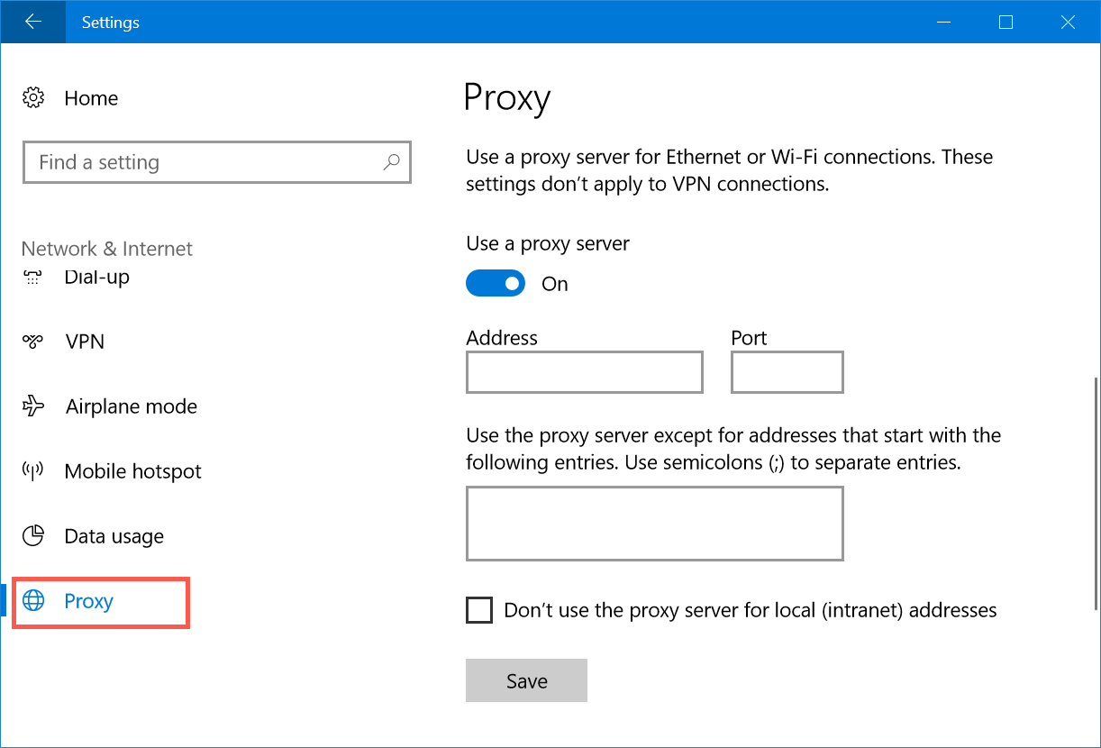 Как обойти прокси-сервер для локальных адресов в Windows 10?