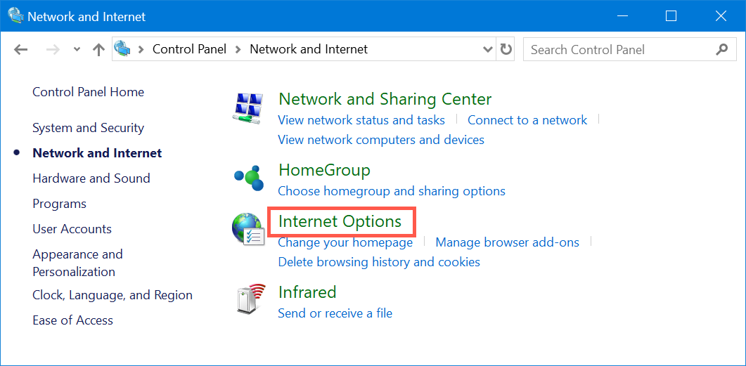 Кроме того, вы можете использовать окно поиска Windows для поиска «параметров Интернета» и открыть диалоговое окно «Свойства Интернета».