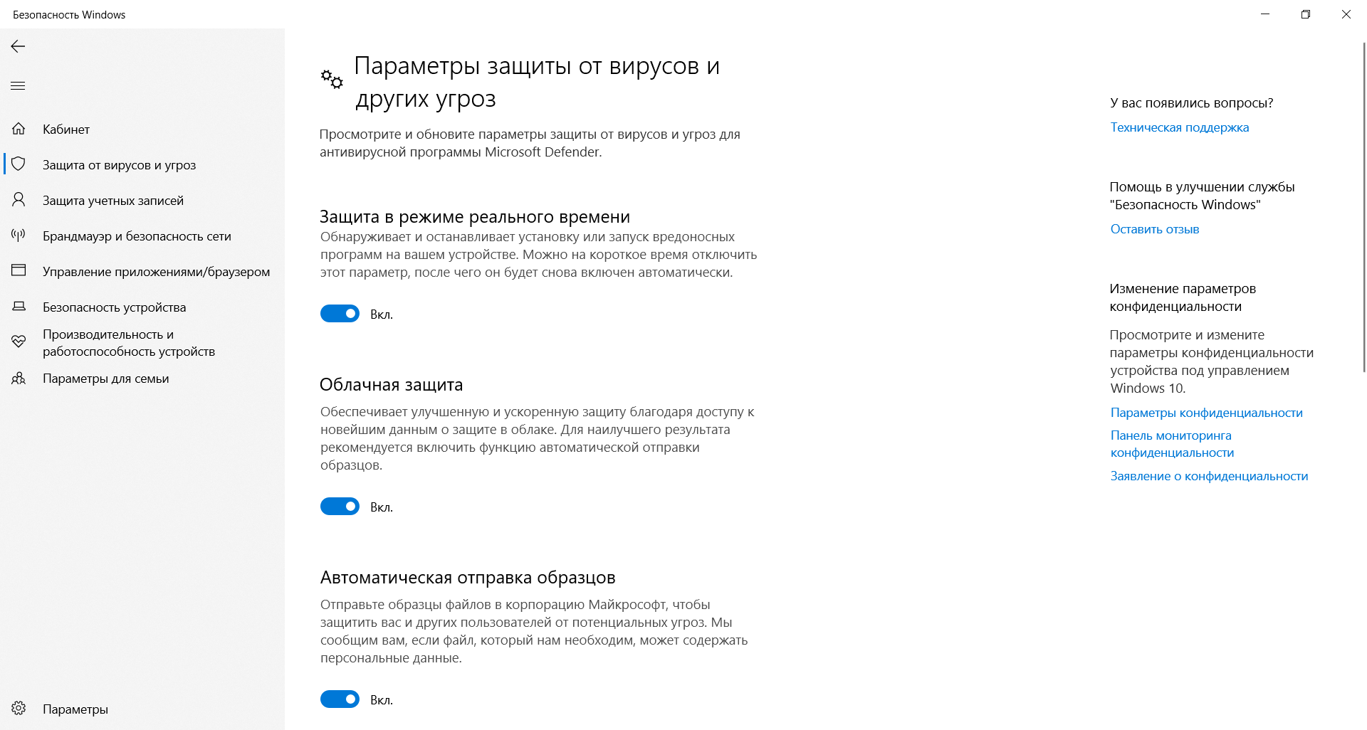 При инсталляции операционной системы Windows все типы защиты подключаются автоматически, и в большинстве случаев настройки остаются в значении «по умолчанию» на весь период службы ПК. При необходимости есть возможность временно отключить антивирусный модуль или изменить параметры проверки файлов, а также подключить контролируемый доступ к папкам.