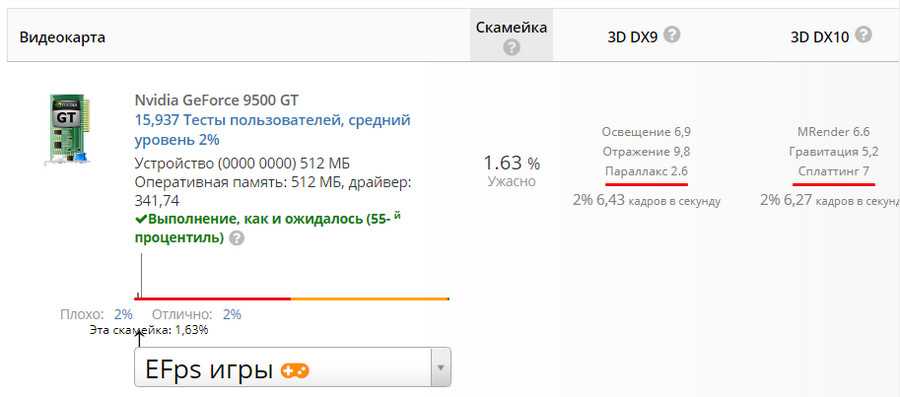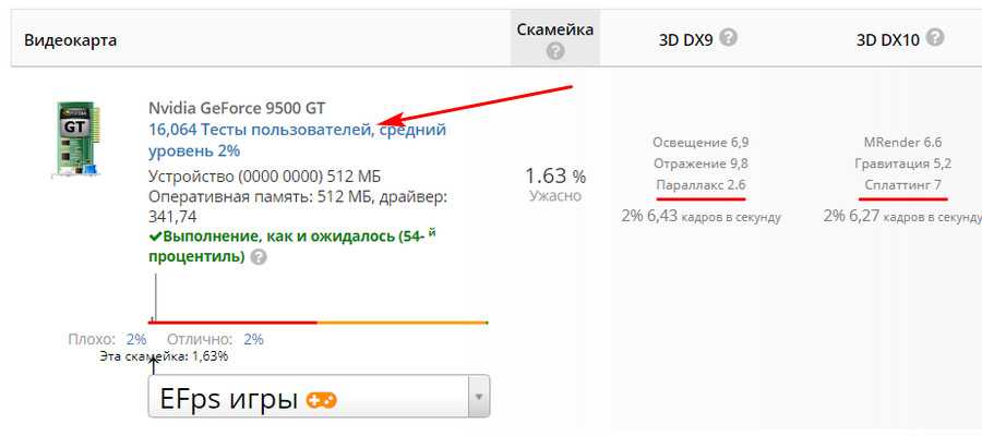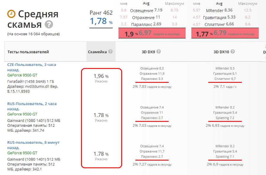 И посмотреть результаты тестирования других пользователей, а также проанализировать усреднённую оценку этого устройства. Например, в нашем случае видеокарта в составе других сборок ПК набрала примерно такой же днищенский процент производительности.