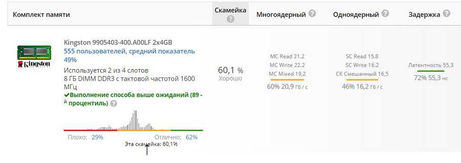 Ну и последний протестированный компонент системы – оперативная память. Она набрала 60,1%, и это очень хороший результат как для устаревшей памяти DDR3 с частотой 1600 МГц.