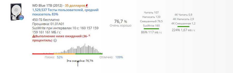 А вот наш несистемный диск HDD пришёлся по нраву оценочному механизму сервиса UserBenchmark, он получил аж 76,7%. Но этот диск, как упоминалось выше, незначительно влияет на общую оценку всей системы. Хотя для компьютера, выполняющего обывательские задачи, важна скорость чтения и записи не только системных данных, но также пользовательских файлов, которые у многих ещё хранятся на дисках типа HDD.